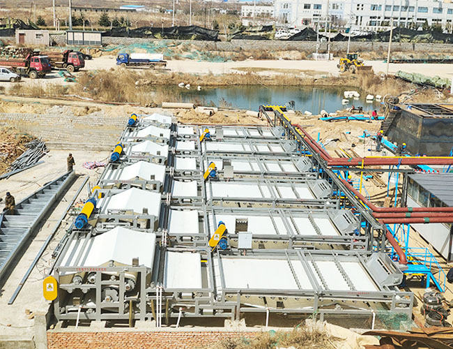 洗沙污水處理設備主要由驅(qū)動裝置、機架、壓榨輥、上濾帶、下濾帶、濾帶張緊裝置、濾帶清洗裝置、卸料裝置、氣控系統(tǒng)、電氣控制系統(tǒng)等組成。