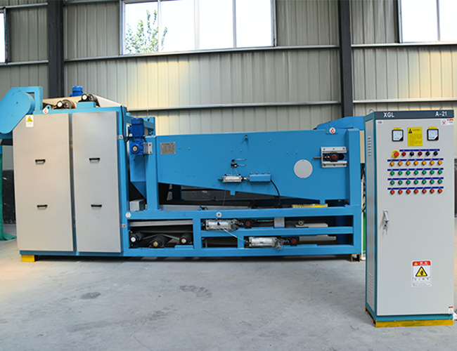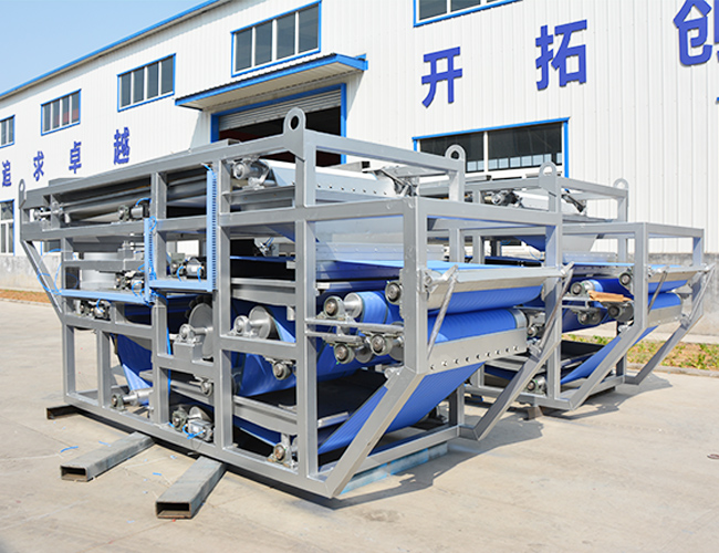 LBDD帶式壓濾機由若干個不同直徑的輥筒及安裝在支架上的攪拌罐組成,由傳動輥帶動的上、中、下網(wǎng)、脫水輥、漲緊輥、導(dǎo)輥、糾偏裝置以及脫水輥兩端的密封裝置組成。濾網(wǎng)采用壓縮空氣氣壓漲緊,使整條網(wǎng)帶保持恒定漲力,不會因進(jìn)料量的變化而引起漲力的變化,該機還配備氣動調(diào)偏裝置,更方便操作和管理,更為新型實用的特點是在至少一個或多個脫水輥兩端設(shè)有密封裝置,該密封裝置由密封帶和驅(qū)動密封帶的滾輪組成,密封帶壓置在上網(wǎng)和下網(wǎng)重疊后的橫向兩端,且在滾輪間設(shè)有一漲緊輥。隨著脫水輥的轉(zhuǎn)動,帶動密封帶及輥輪從動轉(zhuǎn)動,這樣,中、下網(wǎng)之間的漿料除受到脫水輥的擠壓作用外,還受到密封帶的擠壓,從而起到強化脫水和密封漿料的目的。